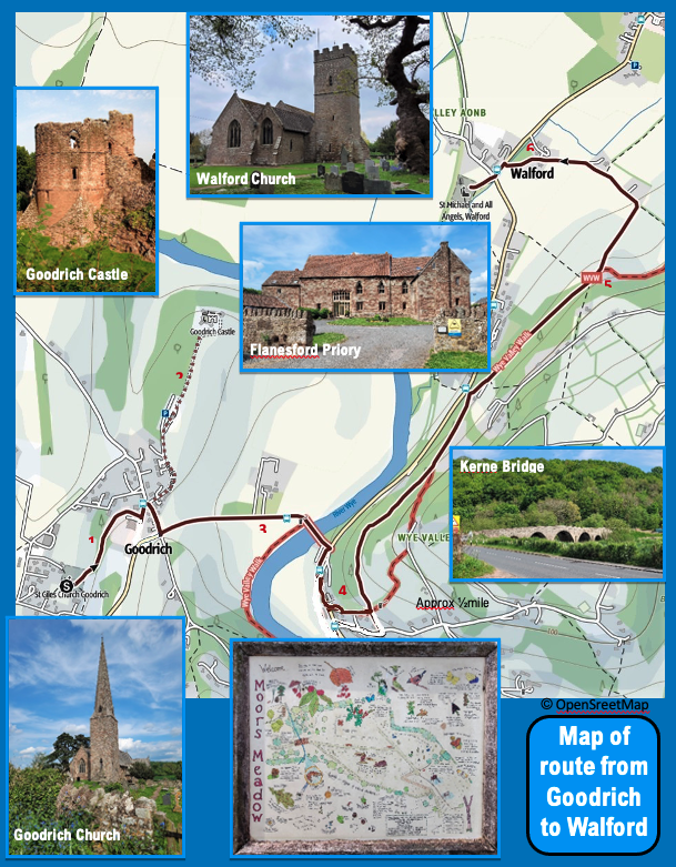 - A worthwhile diversion at this point is to take the lane to Goodrich Castle, (English Heritage, entrance fee) approx 600 yards each way. Goodrich Castle is one of the most complete medieval castles in England. The castle has a café and toilets. A signboard at the entrance to the lane indicates if the castle is open. After a visit retrace your steps.